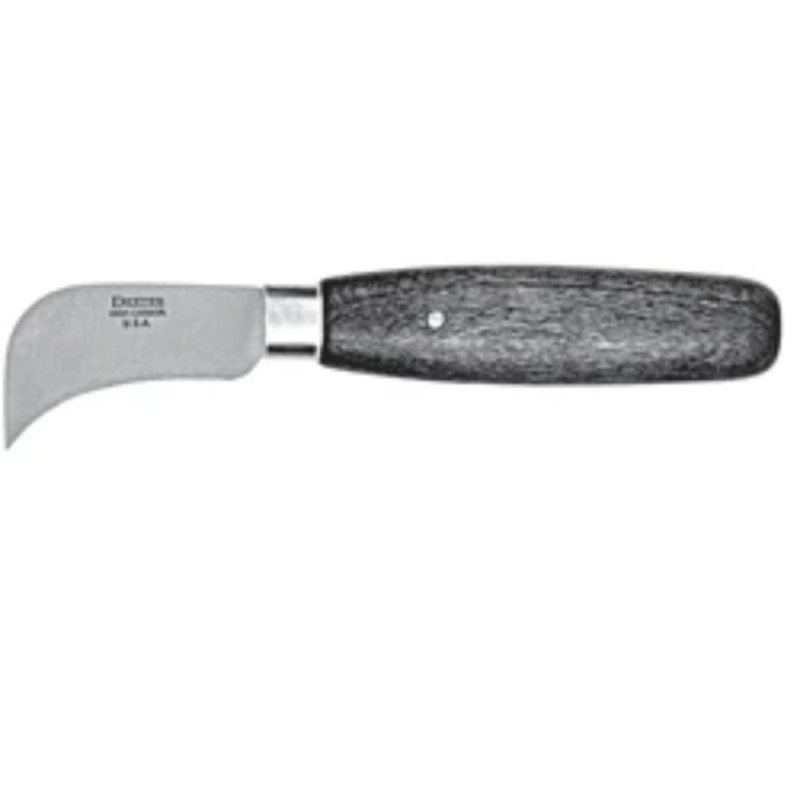 A Dexter vinyl knife with a heavy gauge short hook blade 2" long. Has a round wood handle with a burnt finish.